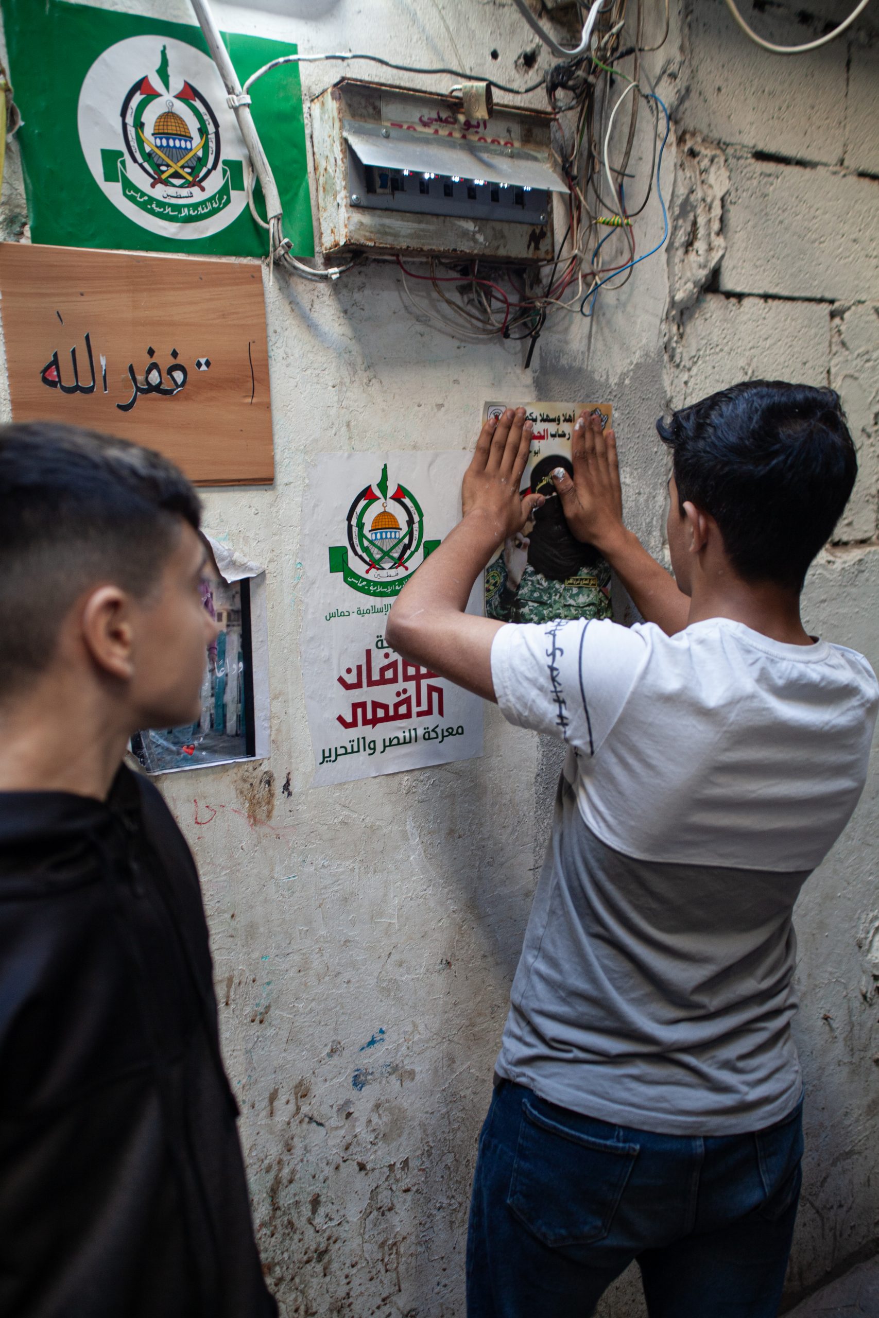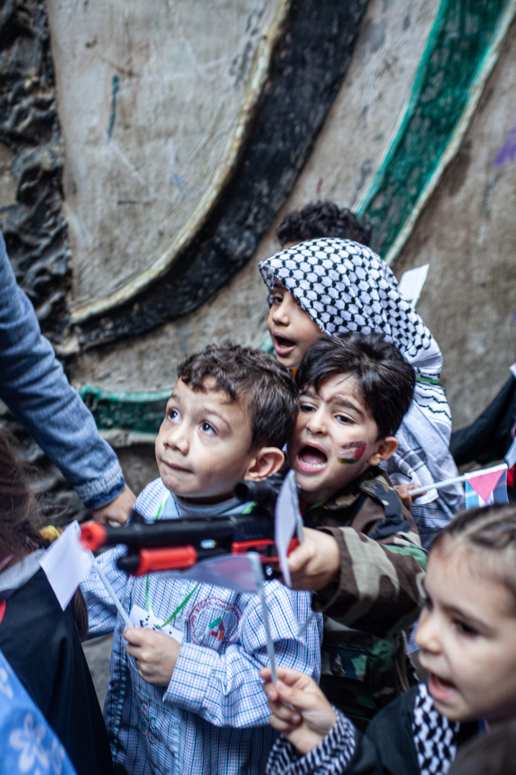 « Vive la Palestine ! », « Libérez Gaza ! » scandent des dizaines d’enfants, habillés en militant et/ou en combattant palestinien. Ces écoliers, encadrés par des adultes, manifestent pour s’opposer aux bombardements de la bande de Gaza. Certains d’entre eux, à peine sept ou huit ans, ouvrent la marche en portant un faux cadavre d’enfant « martyr » sur leurs épaules. Ils sont vite suivis par une ribambelle d’autres bambins, filles et garçon, brandissant des pancartes et des photos des victimes des bombardements. Après le passage de la masse des militants dans les étroites et sombres ruelles, des groupes d’adolescents commencent à coller des affiches. L’une sur un mur, l’autre sur vitrine et la troisième est déposée sur la petite remorque d’un scooter.  Certaines, collées plus discrètement, se superposent à des posters plus anciens. Sur ces nouvelles affiches, il n’y a aucun portrait d’Abu Omar ou de Mahmoud Abbas, le président de l’autorité palestinienne. En premier l’on voit apparaitre les visages des combattants tués récemment à Gaza. Ensuite émerge une image d’ Abu Hamza (porte-parole du jihad islamique palestinien) ou encore une du porte-parole du Hamas, Abu Obayda, qui est le nouveau héros depuis l’attaque du 7 octobre. « Ces jeunes-là attendaient une action militaire contre l’ennemi de toujours. »  affirme un badaud qui pointe du doigt les colleurs d’affiches. « Le Fatah est décrié pour son inaction militaire et sa corruption généralisée. Mais Toufan al-Aqsa a tout changé. »