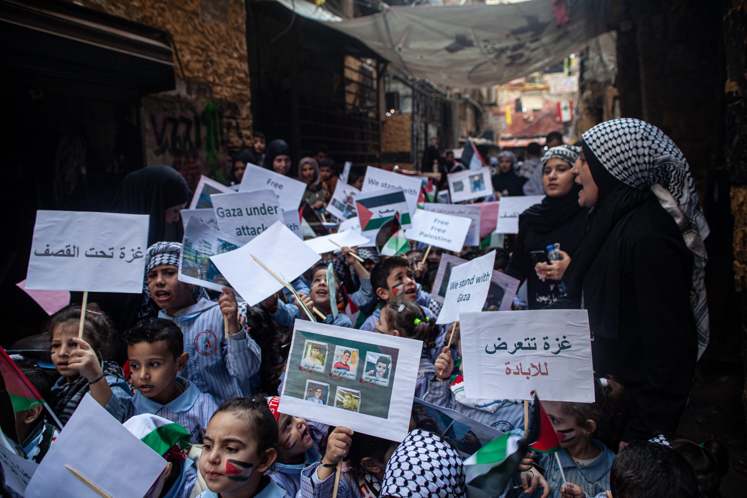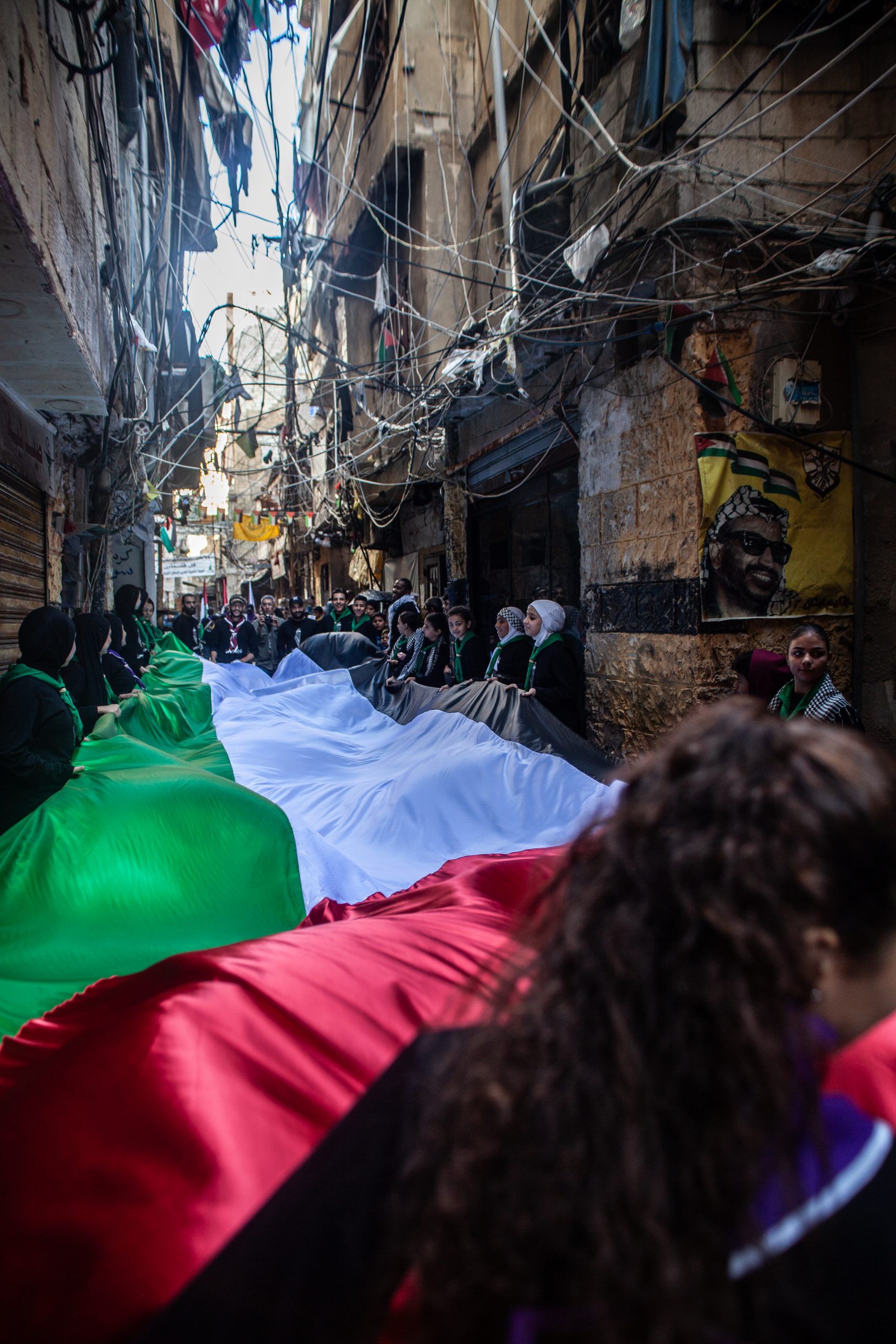 « Toufan al aqsa » (le déluge d’al Aqsa), nom donné à l’opération militaire du Hamas lancée le 7 octobre, a bouleversé les rapports de forces qui existaient entre les trois principaux groupes palestiniens. L’attaque du Hamas a permis à ce parti islamique de gagner un important soutien au sein de la population palestinienne. Le Fatah, parti séculaire, qui règne d’une main de fer sur la Cisjordanie, depuis que le Hamas lui a ravi la bande de Gaza, est en perte de popularité. Une partie de la population lui reproche sa corruption, son manque de succès diplomatique et son inaction militaire. « Les jeunes sont en effervescence. Regardez-les enfants, filles comme garçons jouent à la guerre. Les jeunes, qui n’ont pas de futur et qui se sentent abandonnés, voulaient de l’action », explique Mohammad, un survivant du massacre de Sabra Chatila en 1982. La population palestinienne est très jeune. L’âge médian à Gaza et en Cisjordanie est de vingt ans environ. Une part significative de ces jeunes qui ont grandi sous embargo et/ou sous l’occupation avec peu d’espoir dans l’avenir, dans la précarité économique et pour certains élevés dans la culture de la revanche sur Israël voulaient que les choses changent. Aujourd’hui une part non négligeables des Palestiniens considère le Fatah comme le parti de la compromission et le Hamas comme le parti de l’action. Un professeur encadrant la manifestation des enfants déclare, face caméra « Je suis depuis toujours un militant du Fatah. Mais depuis le 7 octobre, je soutiens le Hamas ». Sur les murs du camp de Chatila, le vert du Hamas remplace peu à peu le jaune du Fatha.