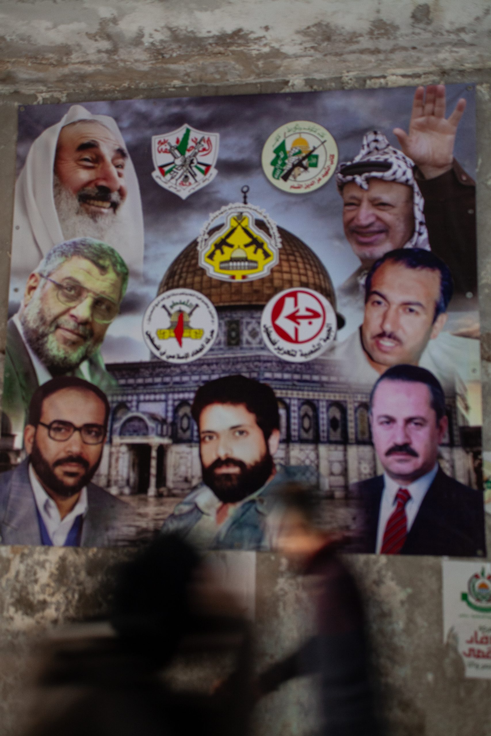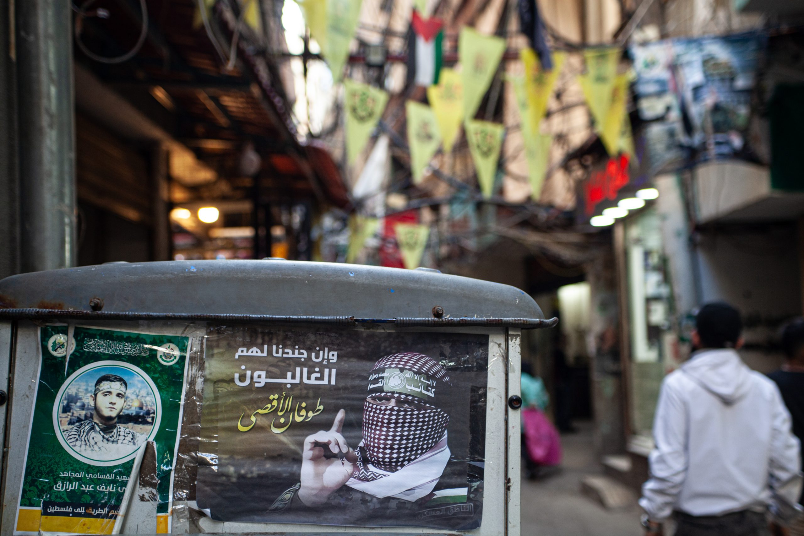 Chatila est une Palestine miniature, « toutes nos divisions y existent » explique Rami, un journaliste palestinien vivant au Liban. En effet, sur les murs, les fenêtres, sur chaque espace mural disponible, on peut apercevoir des affiches, des drapeaux et des posters. Au-dessus des gens, des guirlandes de drapeaux jaunes ou verts se joignent au méandre des tuyaux et de câbles électriques. Aucun espace n’est abandonné. Rami poursuit ; « Ici tout est instrumentalisé par les partis politiques. Chaque rue, chaque maison, chaque famille, chaque espace d’affichage est un enjeu dans la compétition que se mènent le Fatah, le Jihad islamique et le Hamas ». En effet, depuis leur création, les différentes factions palestiniennes s’affrontent pour devenir l’unique champion de la cause palestinienne. À Chatila, l’un des fronts est celui du collage d’affiches. Aux côtés des drapeaux palestiniens et des photos des « shaheeds » (martyrs), de multiples affiches de Yasser Arafat, de Saddam Hussein, de la mosquée Al-Aqsa côtoient des posters du Cheikh Yassine, d’Abu Obayda (porte-parole du Hamas) ou du porte-parole du Jihad islamique palestinien Abu Hamza. L’un des riverains explique que c’est une stratégie de mélanger les portraits des leaders. Il est connu de tous que le Fatah et le Hamas sont ennemis. « Ils s’affrontent depuis des années. Alors, pourquoi mettre une image d’Arafat avec celle d’Abu Obeyda ? Pour plusieurs raisons. Premièrement la figure d’Arafat est extrêmement respectée parmi la population. Mais aussi, en mettant la figure d’Arafat avec celle du fondateur du Hamas, Cheikh Yassine. Cela protège l’affiche des militants du Fatah, car ils ne peuvent pas arracher une affiche d’Arafat et inversement. » Ainsi l’on voit se multiplier les affiches avec des figures des différents partis. Ces affiches n’ont pas pour seul but de gagner les cœurs et les esprits des habitants de Chatila. Elles permettent de délimiter les différentes zones contrôlées par les milices palestiniennes. Cette division territoriale est d’une importance cruciale. Dans le camp, le gouvernement libanais n’est pas présent. Il n’y a ni forces de police ni service public. Ce sont les mouvements palestiniens qui se substituent à l’État. Le Fatah, le Hamas et le Jihad islamique palestinien possèdent chacun leurs propres services. Ainsi, dans un quartier contrôlé par le Fatah, les électriciens, les agents en charge de l’eau et les autres employés « publics » sont des membres du parti. Le Hamas et le Jihad islamique agissent de même. Ces services permettent aux mouvements palestiniens de gagner des fonds et de renforcer leur contrôle sur ces zones et leurs populations. Mais depuis le 7 octobre, les affiches du Hamas se multiplient à Chatila.